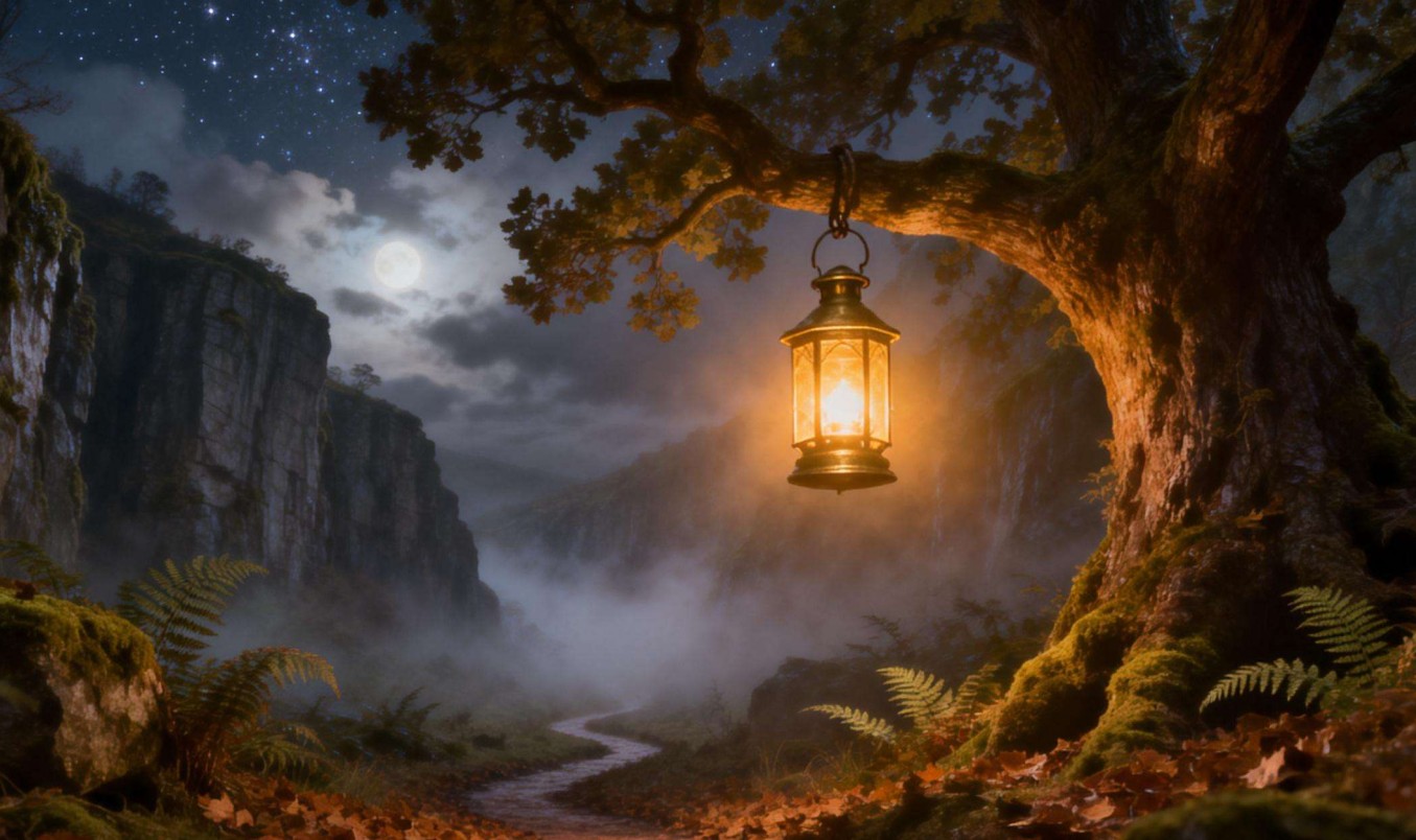The glow wasn’t fungal; it was lantern-light. A lantern suspended in the black maw of the tree, swaying though the air was still.