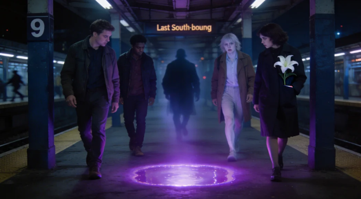 The platform was a hollow throat, tiled in cigarette yellow. Every bulb had dimmed except the one above Bench C, where the neon tube flickered an impossible violet. Lena approached first, sneakers squeaking. The moment her shadow crossed the light, the air felt skin-thin, as though the city exhaled. She turned to wave the others closer—but they were gone. The platform was empty, yet she could still hear their heartbeats, four syncopated drums echoing inside her skull.