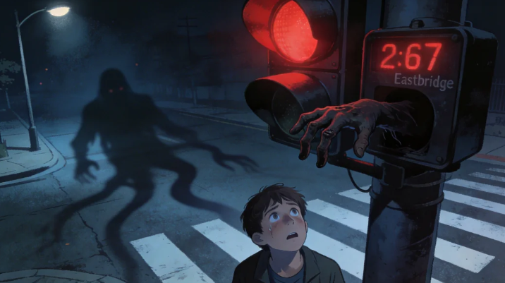 I’m no monster. I wasn’t trading strangers. I left the bar wired, checking every streetlamp like it might open its mouth. 2:07 a.m. approached. I planned a different route—take the bridge, skip 4th & Main entirely. But Eastbridge has a twisted sense of humor; every turn spun me back to that intersection. The light glared red, rain-free tonight, air still as a held breath.