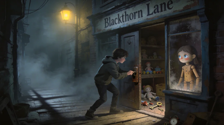 Ma had warned me: “Row, stay off Thorn Lane after the bells.” But Ma’s warnings were like expired milk—sour and easy to ignore. So I skulked past the boarded bakery, hoodie pulled Goth-black, boots slapping puddles that reflected no moon. The toy shop window glowed bruise-purple, and there she was: wooden girl, jointed elbows, cracked porcelain face painted with a smile too wide for her head. Every year since I was ten she’d shifted—first by the till, then near the staircase, now inches from the glass. Tonight her painted eyes tracked me like a cat clock.