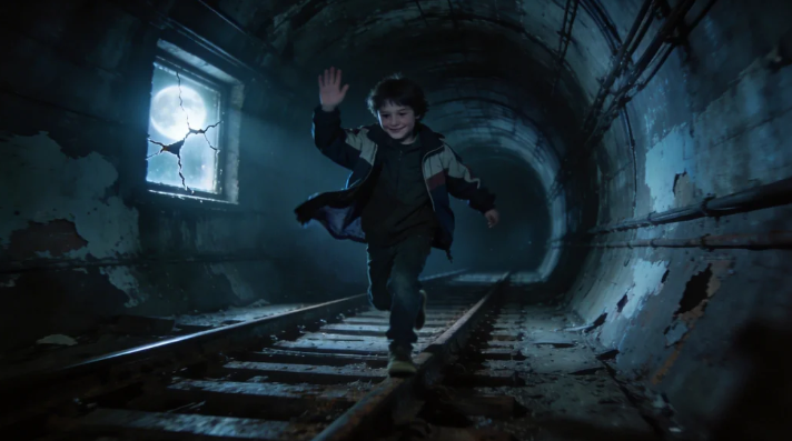 I tell myself it’s the Red Bull wearing off, but my feet stop anyway. There’s a gap in the plywood big enough for a phone lens, and before I can think better I’m filming. Screen’s dark at first, then the pixel mess clears and there he is: windbreaker shiny under one busted bulb, hood up, smiling like we’re old pals. He jerks his thumb down the tunnel—come on, man, the train’s waiting. I laugh, because what else do you do at half-two in the morning when a ghost kid tries to ghost-hail you?