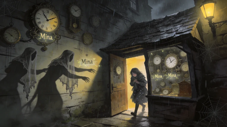 While my socks dried on the hearth, she showed me her favorites: a grandfather clock whose face showed phases of the moon instead of numbers; a pocket watch that ticked backward; a cuckoo that popped out wearing a tiny mourning wreath. “Clocks remember,” she whispered. “They keep the bits of us we forget to carry.” I nodded like I understood, but my skin kept prickling. Every time I glanced at the mirrors between the shelves, I saw her twice—once beside me, once inside the glass, standing closer.