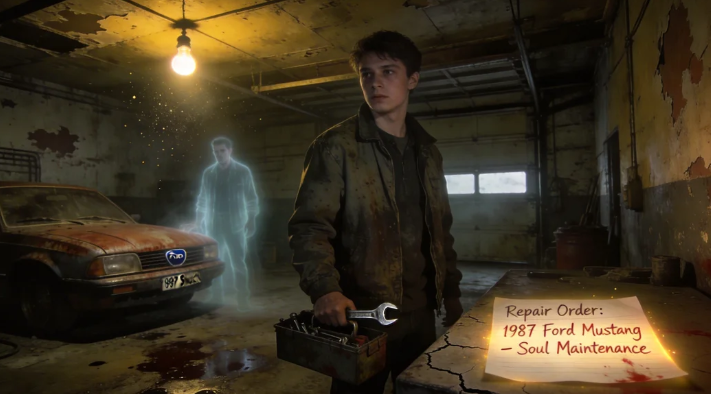 Down there it wasn’t dirt or concrete; it was the bottom of the Rotterdam channel, bikes and cars half buried, mechanics in coveralls drifting like kelp, each holding tools, each eyes glowing the same numbers. They reached out, not angry, just tired. I understood: every unfinished repair ties a soul to the shop that birthed it. Uncle Dirk had fixed machines his whole life, died mid-job, and created a backlog stretching into forever. He’d been waiting for another Griggs dumb enough to pick up the wrench. Now it was my shift.