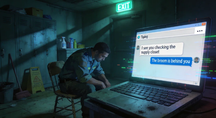 So if you ever find a link to ChatRoom 404, do yourself a favor: let the stain stay. Some messes aren’t meant for humans. And if your typing indicator ever starts bouncing on its own, well, say hi to MopMan for me. I’ll be the one scrubbing in the corner, forever on night shift, Wi-Fi signal full bars, heart buffering at 99%.