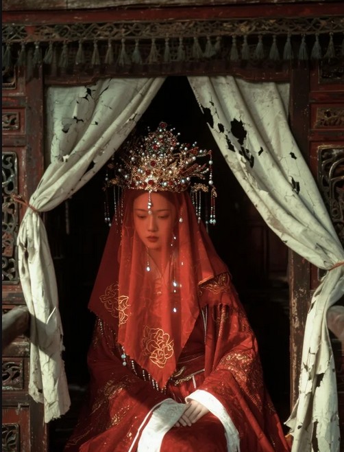 Halfway down he saw her: a figure in an antique bridal gown, scarlet veil stitched with gold thread. She stood motionless, face hidden, one pale hand beckoning. Chen’s pulse spiked—perfect content. He raised his camera.